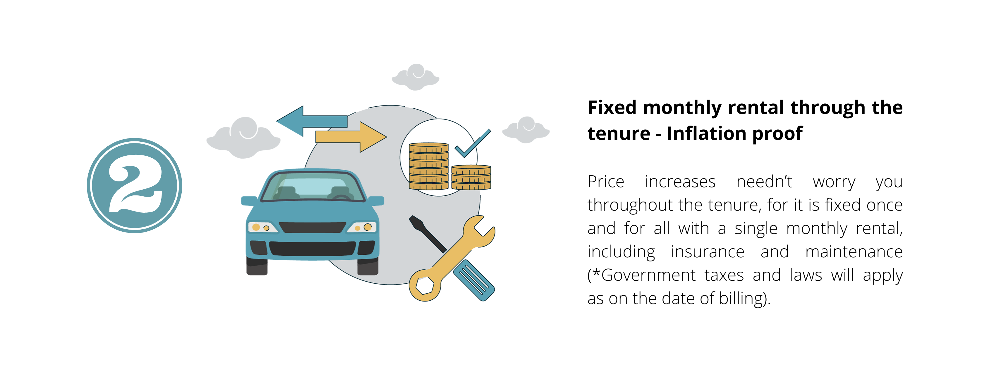 A single fixed monthly lease rental includes the Onroad price of the vehicle, the Insurance and the maintenance. And Completely Inflation free. And it compares well with a Finance loan EMI which only covers the Onroad price of the car.