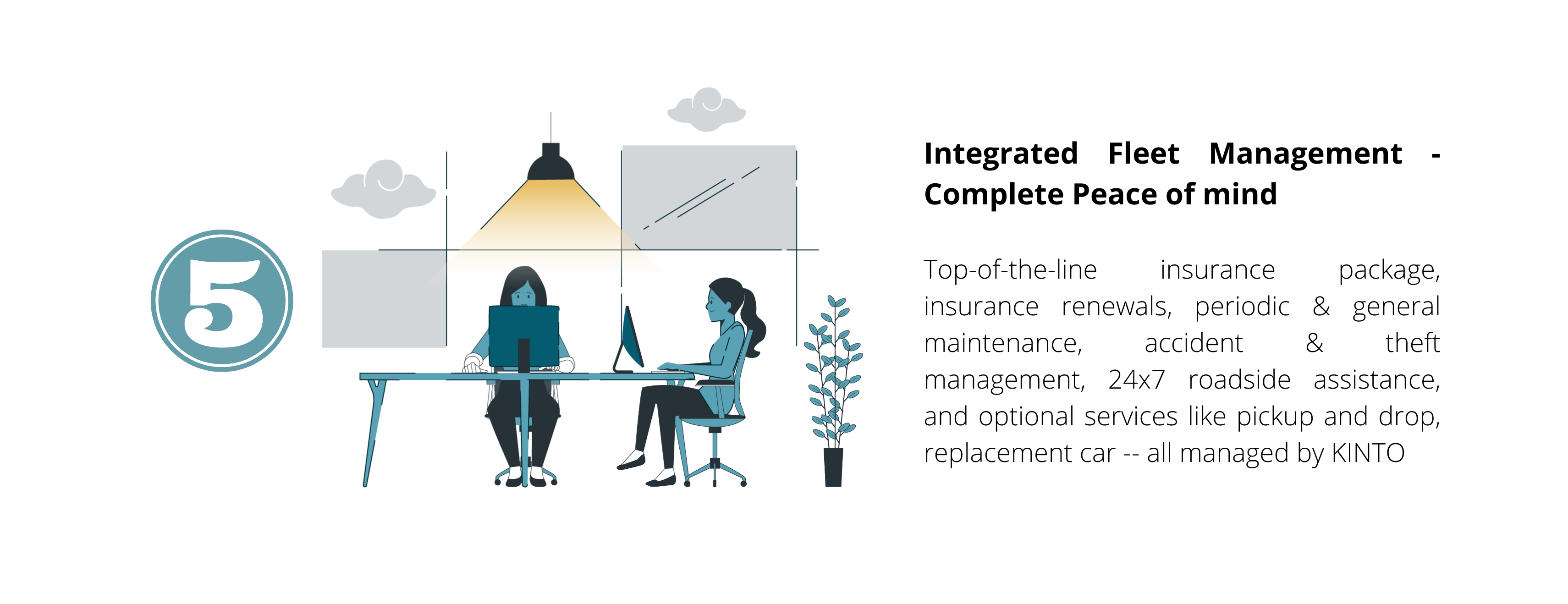 Kinto takes care End to End, right from procuring your car, paying the road taxes, ensure top of the line insurance package, yearly insurance renewals, entire maintenance of the car. And also takes care of 24x7 roadside assistance, any accident or theft management too. And as an option you can even have a pickup & drop facility ( for servicing ) and a replacement car too ( if car in the workshop ).